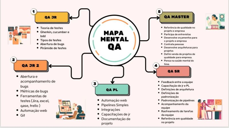 - Analista de QA Sênior / Líder de QA: coordena equipes, define estratégias, cria processos e atua como mentor.